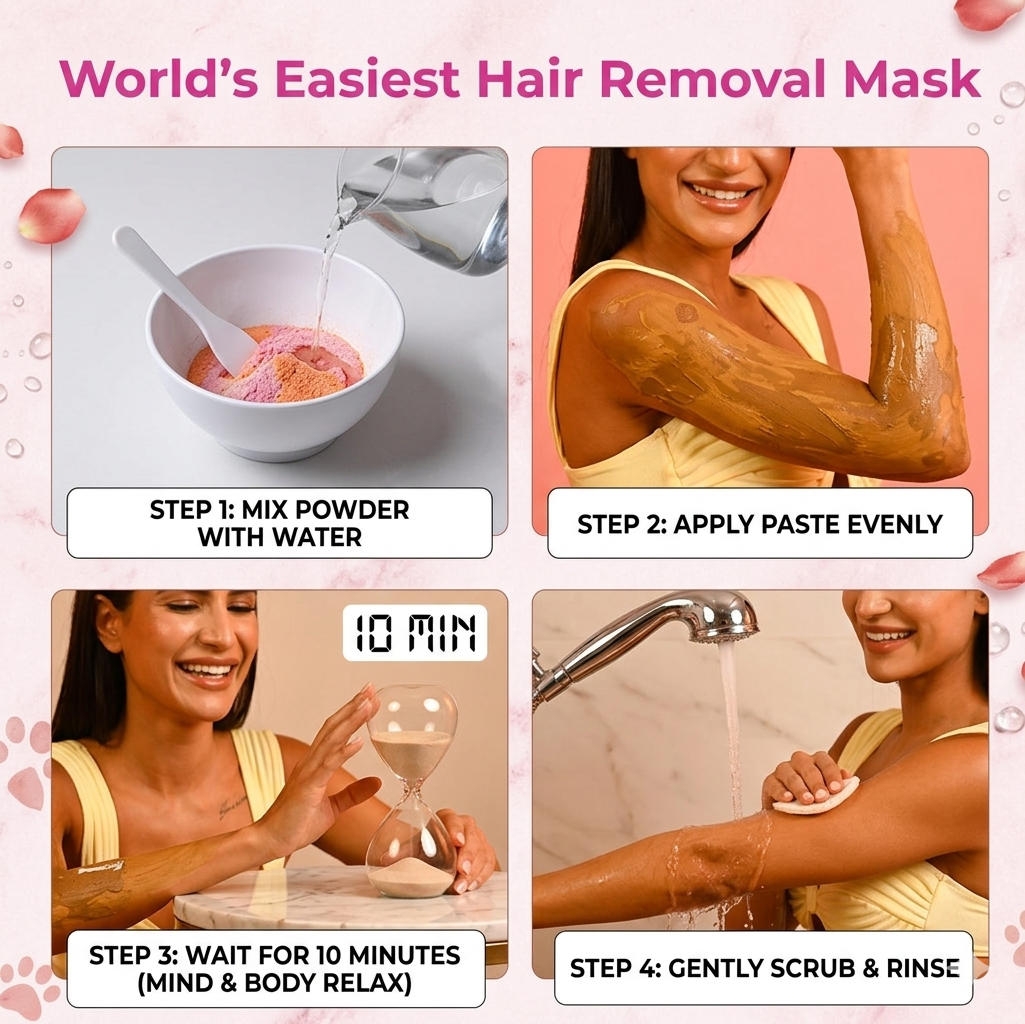 Paste ko apni skin par (haath, paon, ya body) achhi tarah apply karein jahan se hair remove karne hain. - Step 3: Wait & Relax ⏳